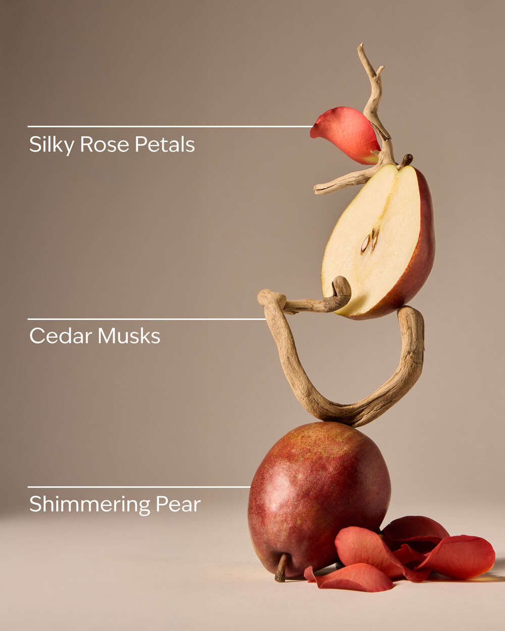 Fragrance notes: shimmering pear, silky rose petals and cedar musks.
