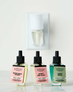 - Because Wallflowers refills contain fragrance oils that may damage finished surfaces and some plastics, always keep a 12″ clearance above your plug to prevent damage to surrounding surfaces.