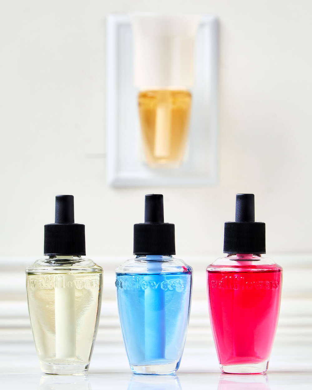 - Because Wallflowers refills contain fragrance oils that may damage finished surfaces and some plastics, always keep a 12″ clearance above your plug to prevent damage to surrounding surfaces.