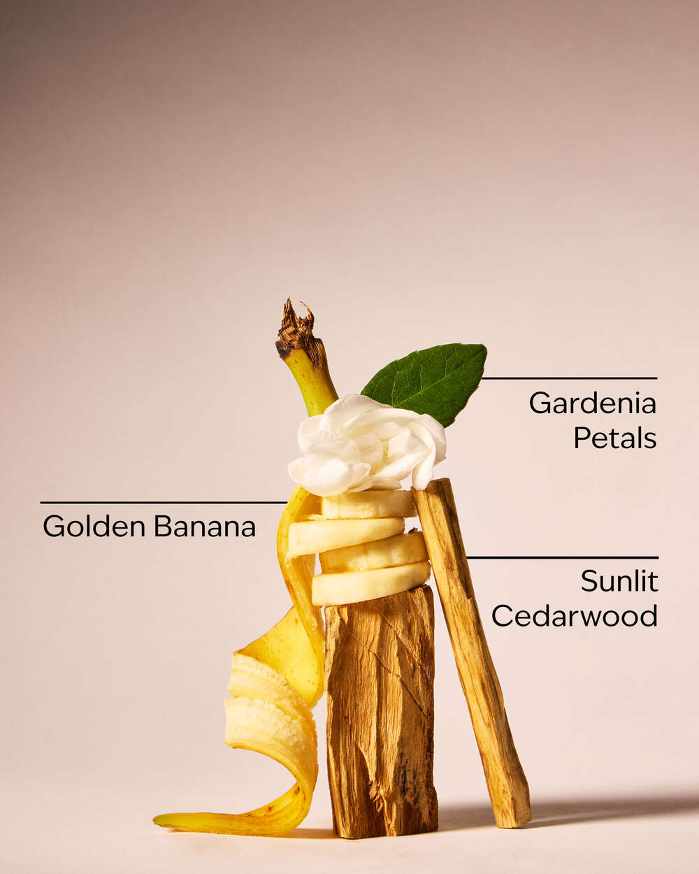 Fragrance notes: golden banana, gardenia petals and sunlit cedarwood.