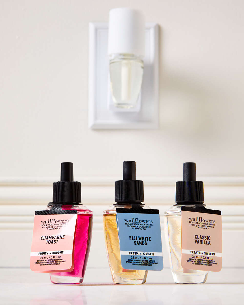 - Because Wallflowers refills contain fragrance oils that may damage finished surfaces and some plastics, always keep a 12″ clearance above your plug to prevent damage to surrounding surfaces.