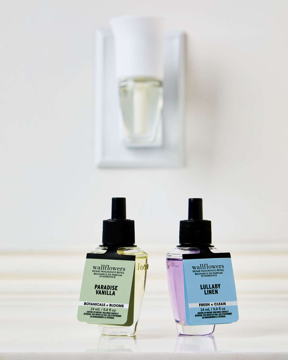 - Because Wallflowers refills contain fragrance oils that may damage finished surfaces and some plastics, always keep a 12″ clearance above your plug to prevent damage to surrounding surfaces.