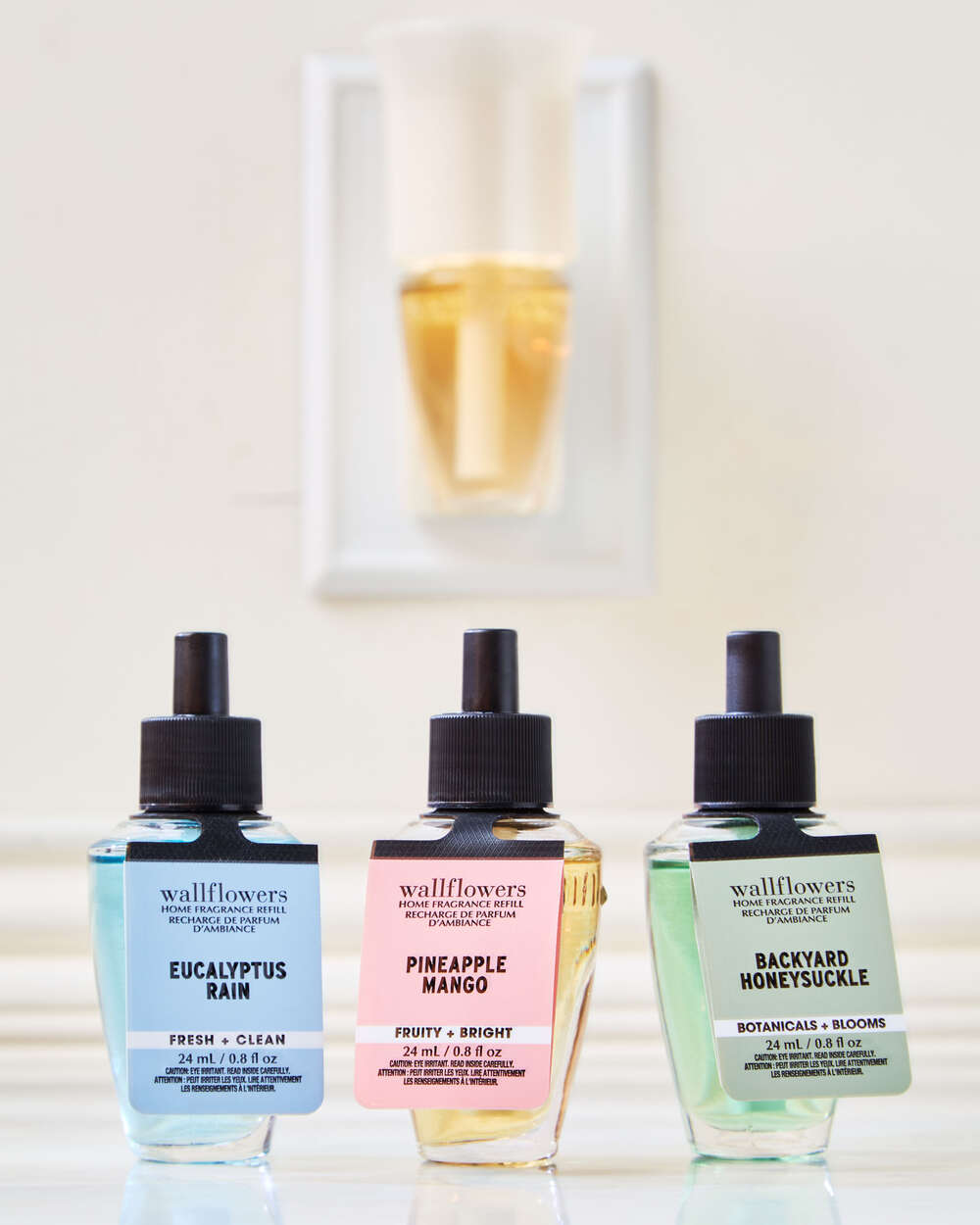 - Because Wallflowers refills contain fragrance oils that may damage finished surfaces and some plastics, always keep a 12″ clearance above your plug to prevent damage to surrounding surfaces.