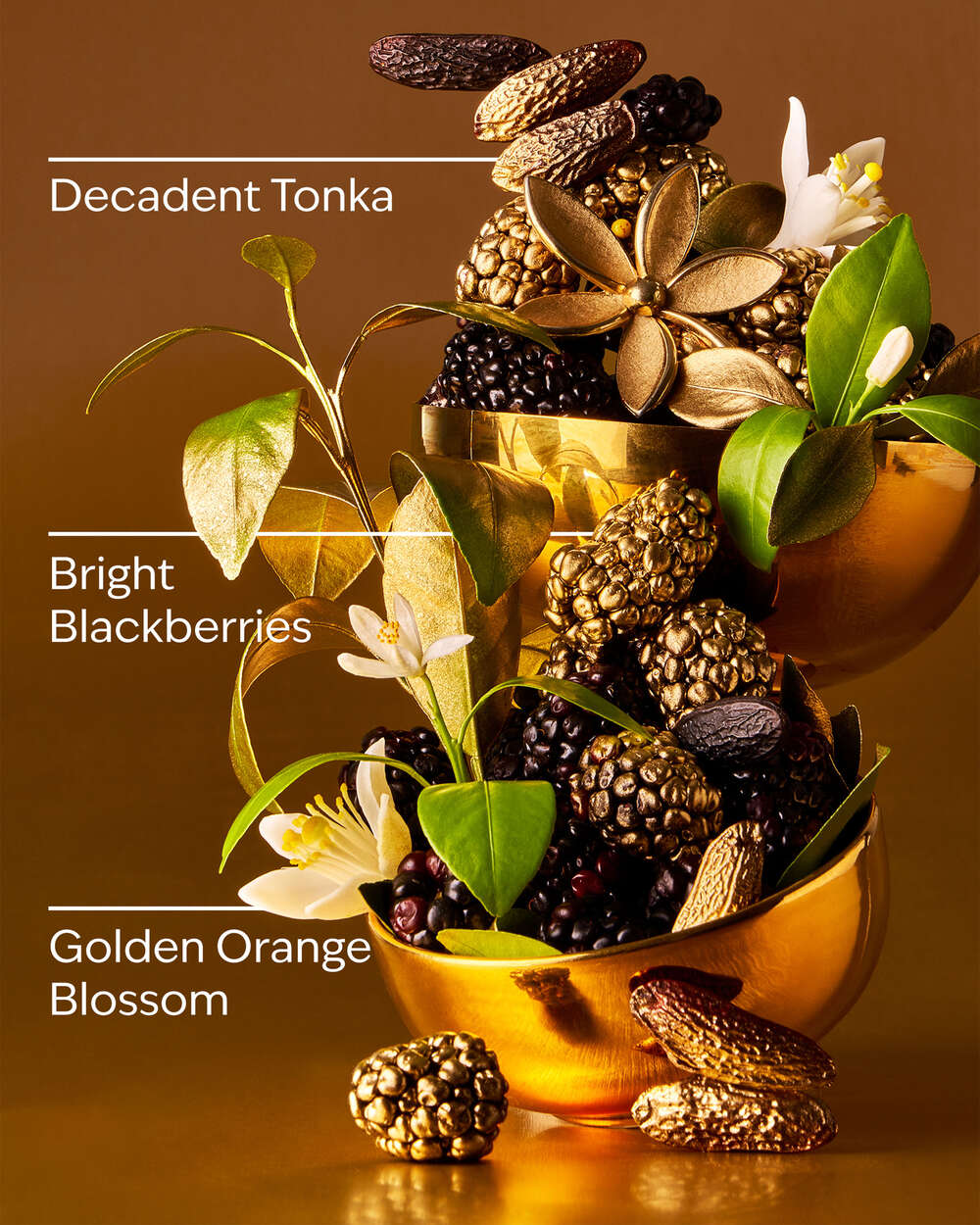 Fragrance notes: bright blackberries, golden orange blossom and decadent tonka.